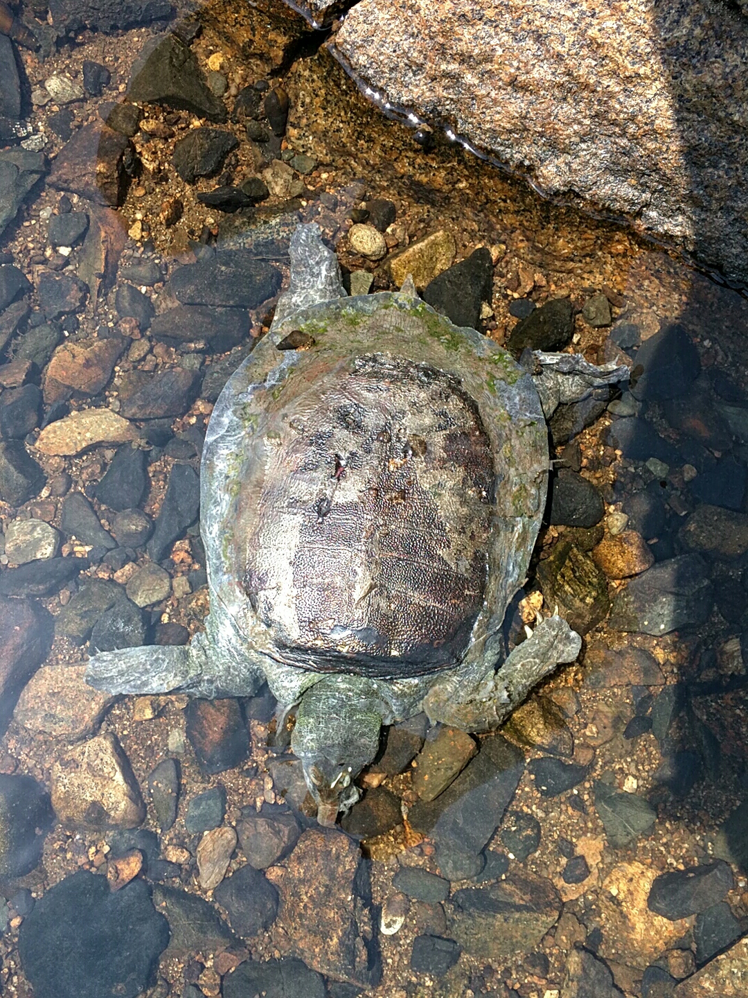 全然逃げる気配が無いので甲羅を突っつくと...反応無し。死んでた。死んでる位置も不自然な気もしてペットを捨てたのか?とも思えた。いろんな事を考えたが、とりあえずビックリした事は、「すっぽんの甲羅は硬い」ことがわかった。見た目的にブヨブヨの甲羅だと絵的に思ってた。でもまあ、死んでるのは残念だが、ぜひ生きてるすっぽんを観察してみたい。