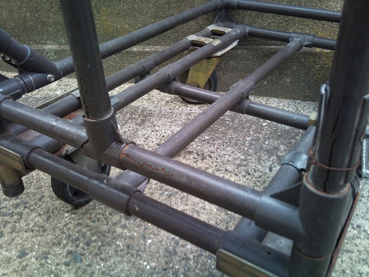 3 そして一番「使えん!!」って思う瞬間はパイプの強度がない。この写真は豆腐屋で使ってる台車なのだが大体120kgぐらいのせてるのだが、矢崎にオーダーして3年ぐらしたらこのとうり。バーに強度なくひわり割れ始める。強度計算してあってもこの通り、まあ使い方にもよるのだろうが・・・ ちなみに割れ始めたので自作で斜めに、ステイとイレクターで補強しました。