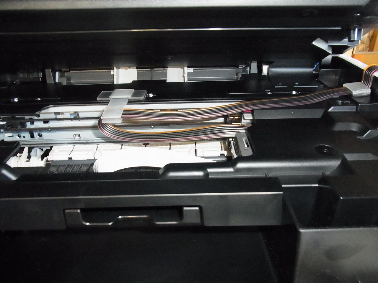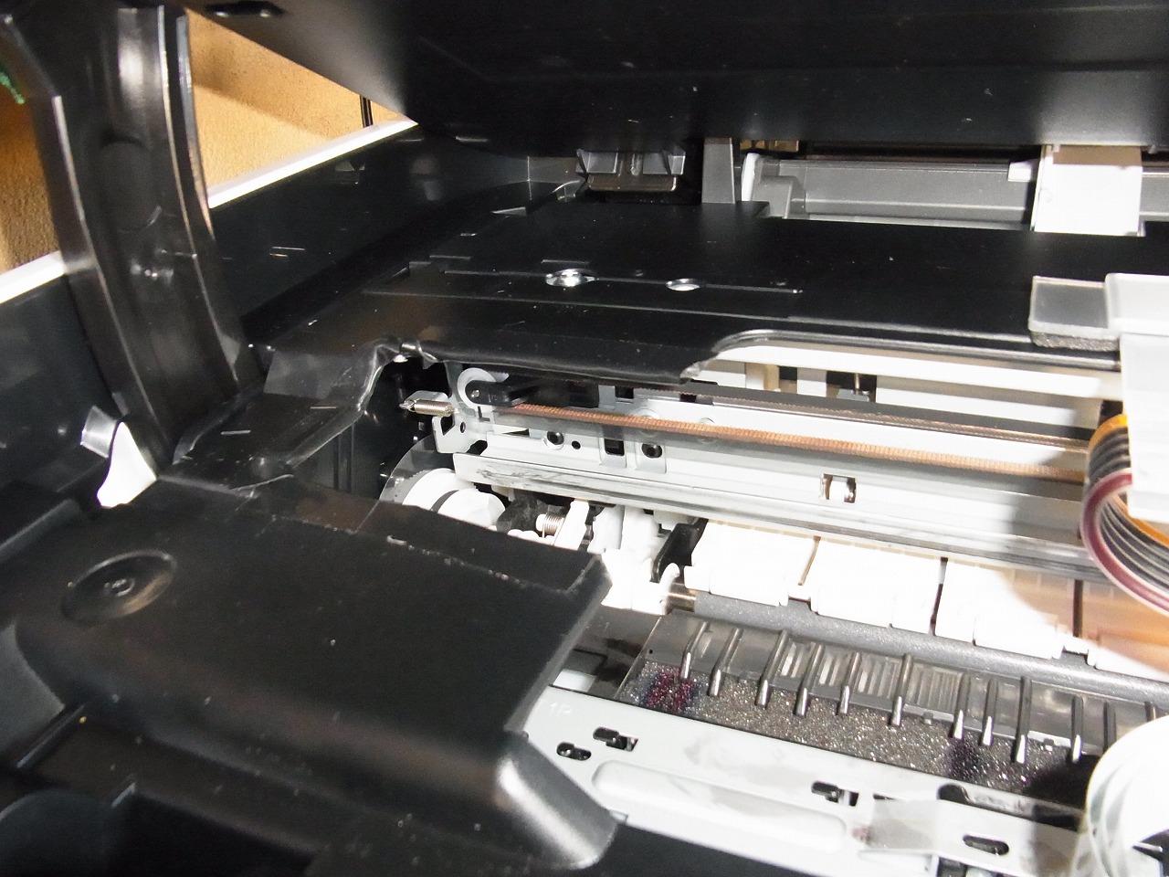 写真の真ん中の部分がカットしたところ。右にインクホルダーが移動したあと、コンセントを抜き、停止させ、ハサミでカットした。これは、MG6230だけなのかわからないが、かならず、干渉するのであたらないと思う所まで切る必要がある。(俺は幅75mm 奥行55mm カット)